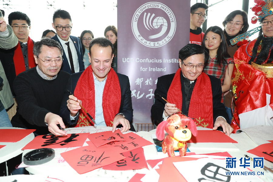2月24日, 在爱尔兰首都都柏林, 爱尔兰总理利奥·瓦拉德卡在中国新春市集活动上学写书法。新华网发 张琪摄