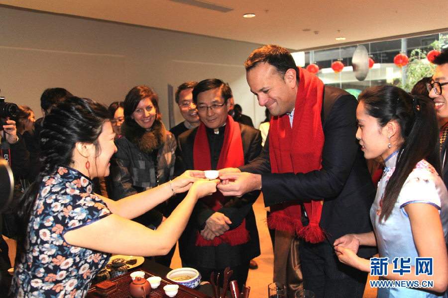 2月24日, 在爱尔兰首都都柏林, 爱尔兰总理利奥·瓦拉德卡在中国新春市集活动上观赏中国茶艺。 新华网发 张琪摄