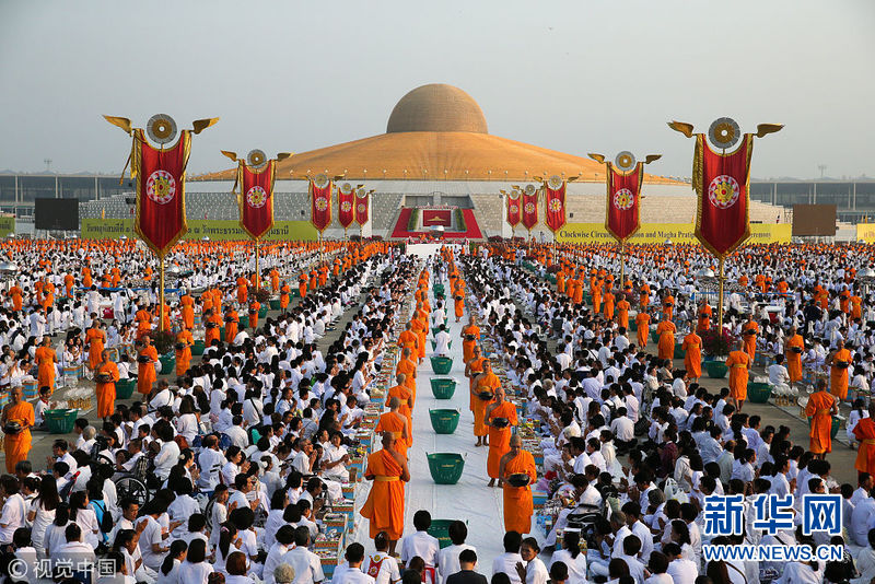 泰国庆祝万佛节 佛教僧侣参加“布施”仪式场面壮观