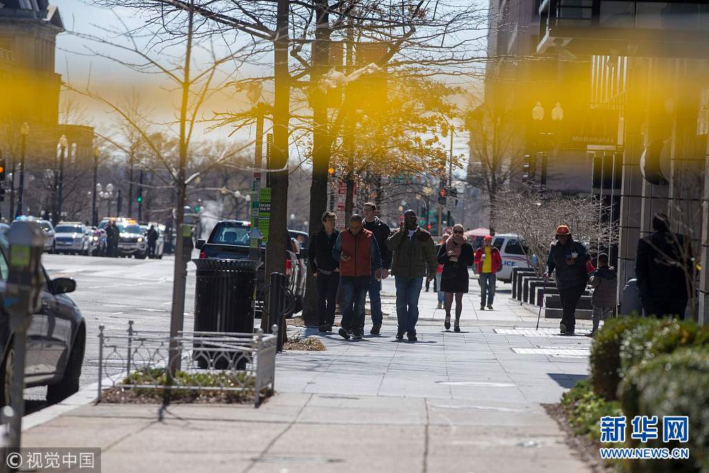 当地时间2018年3月3日,美国华盛顿,调查人员封锁白宫附近街道。一名男子在白宫北部护栏外射伤自己。华盛顿警方称,这名男子已经被宣布死亡。(图片来源:视觉中国)