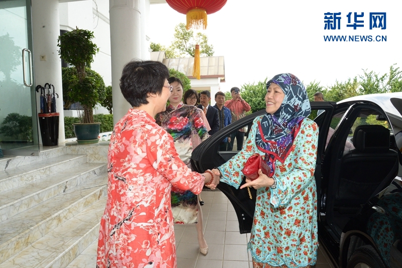 中国驻文莱大使杨健(左)1日在官邸迎接前来参加使馆“开门迎宾”活动的文莱外交与贸易部无任所大使玛斯娜公主。新华网发(杰弗里·黄摄)