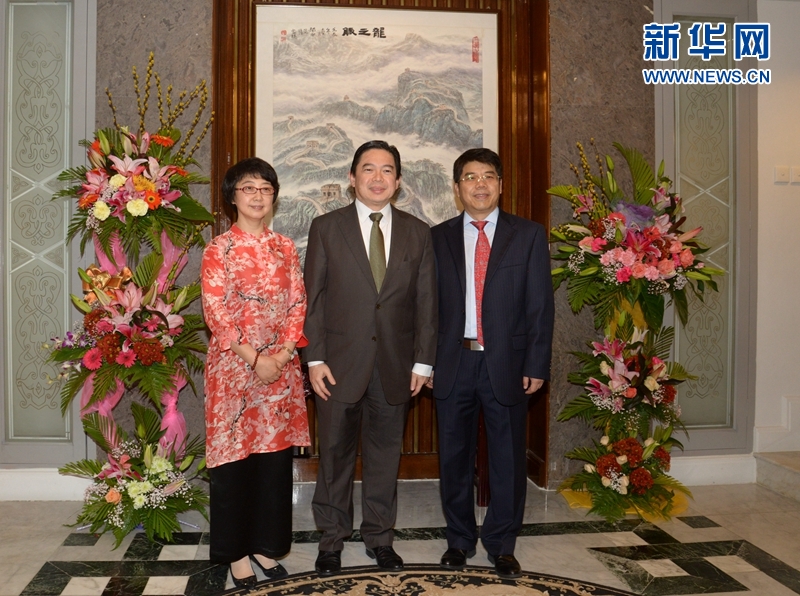 中国驻文莱大使杨健(左)与参加中国驻文莱使馆“开门迎宾”活动的文莱财政部第二部长刘光明合影留念。新华网发(杰弗里·黄摄)