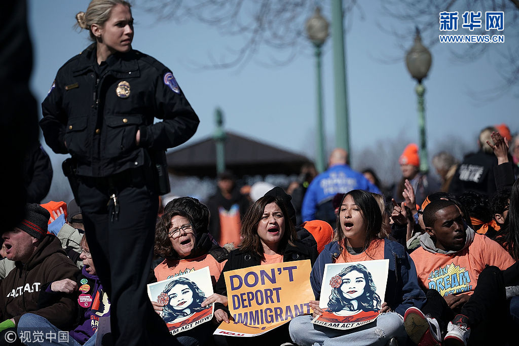 当地时间2018年3月5日,美国华盛顿,移民活动家在国会山举行集会,抗议特朗普终结“梦想法案”计划。(图片来源:视觉中国)