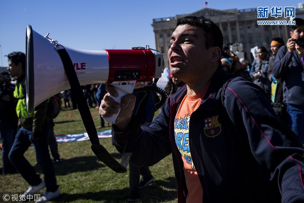 当地时间2018年3月5日,美国华盛顿,移民活动家在国会山举行集会,抗议特朗普终结“梦想法案”计划。(图片来源:视觉中国)