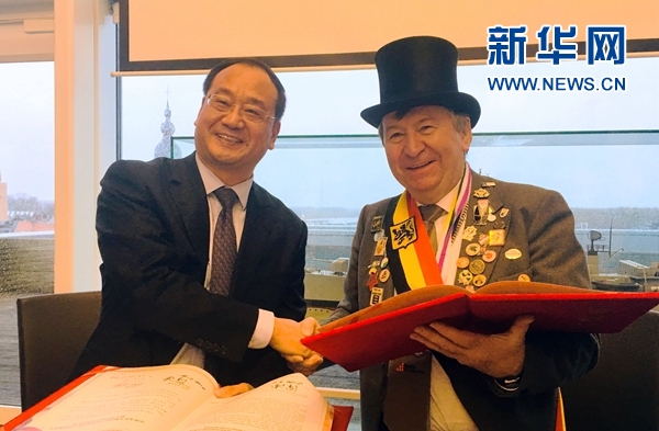 宿迁市人大常委会副主任徐德(左)与特姆塞市市长吕克•德莱克(右)共同签订缔结友好城市协议。新华网记者潘革平 摄