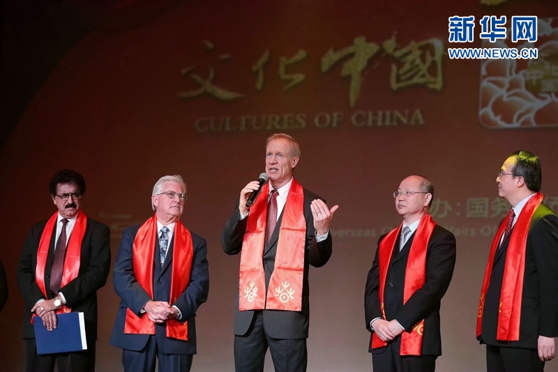 3月6日,在美国芝加哥, 伊利诺伊州州长布鲁斯·劳纳(左三)在演出前发表致辞。 新华网记者汪平摄