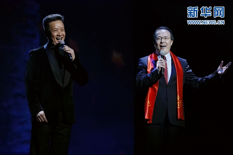 3月6日,在美国芝加哥,歌手阎维文(左)和中国驻芝加哥总领事洪磊(右)合唱歌曲《小白杨》。新华网记者汪平摄