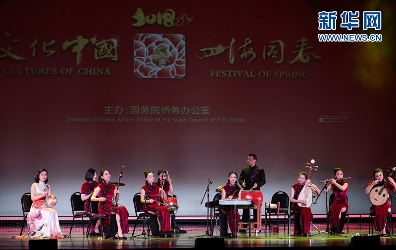 3月6日,在美国芝加哥,来自东方歌舞团的演员表演民乐合奏。 新华网记者汪平摄