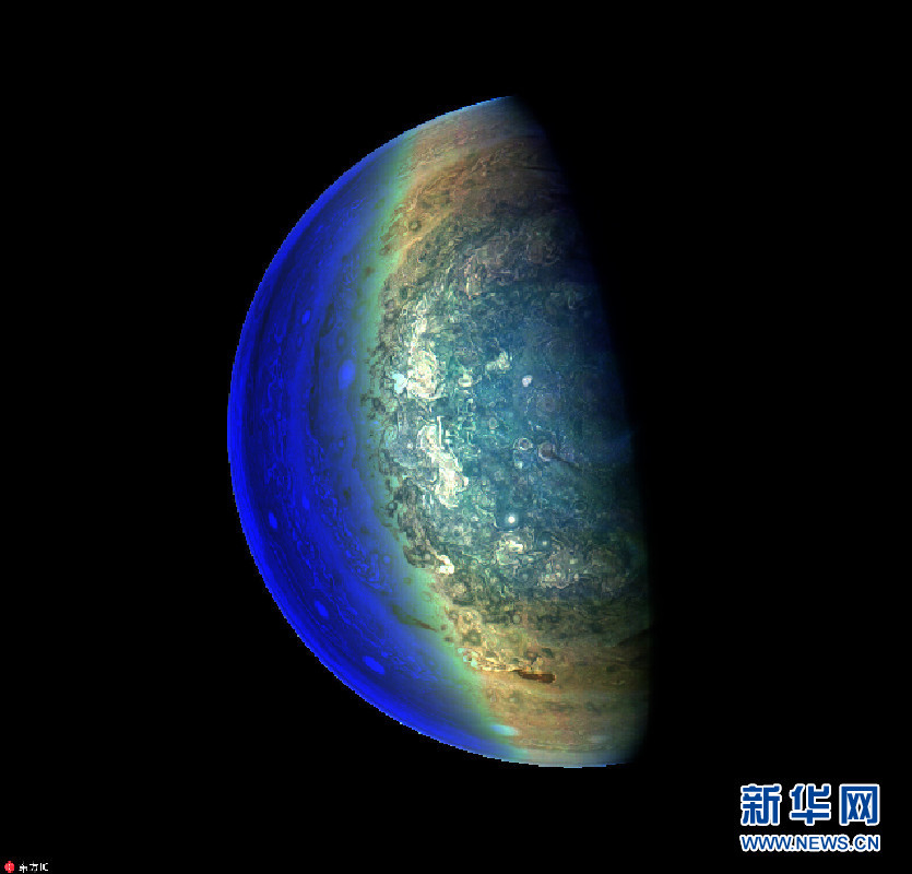 3月2日,美国宇航局(NASA)公布的木星拍摄图,巨大的风暴气旋分布在两极之间,形成奇特的花状图案。(图片来源:东方IC)