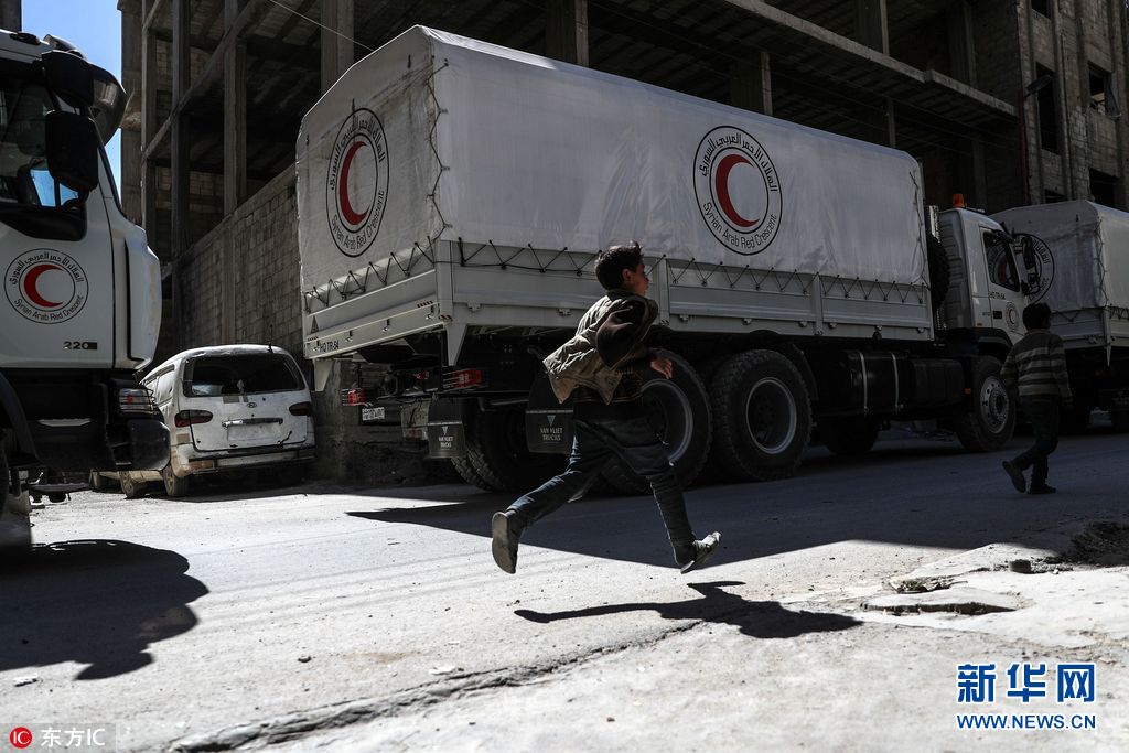 当地时间2018年3月9日,叙利亚,推迟多日后,人道主义救援物资进入东古塔反政府武装控制区并完成卸货,共13卡车物资当天上午从瓦菲丁通道进入杜马区。(图片来源:东方IC)
