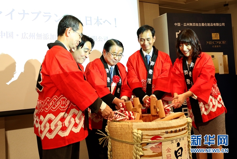 出席当天发布会的嘉宾举行“砸酒樽”仪式,代表该公司产品正式进入日本市场。新华网记者彭纯 摄