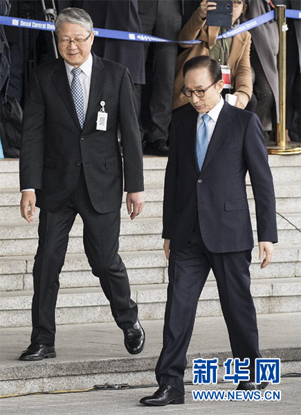 3月14日,韩国前总统李明博(右)抵达韩国首尔中央地方检察厅。韩国前总统李明博因涉嫌贪腐和滥用职权等罪名于14日首次接受检方讯问,他向公众致歉但否认所涉罪名。 新华社发(李相浩摄)