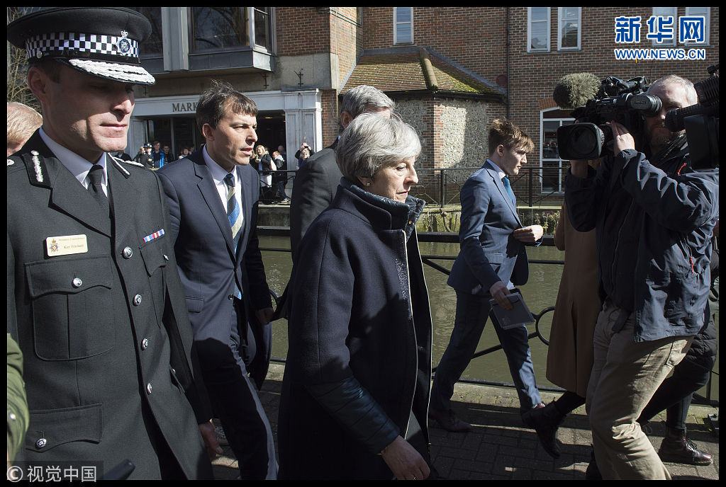 3月15日,英国索尔兹伯里,英国首相特雷莎·梅访问当地,了解俄罗斯前双面间谍斯克里帕尔中毒案进展。俄罗斯前间谍斯克里帕尔及其女儿4日在英国威尔特郡索尔兹伯里市街头一条长椅上昏迷。英国警方说,两人中了神经毒剂。(图片来源:视觉中国)