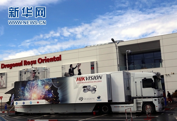 停在布加勒斯特东北部红龙购物中心的海康威视移动展厅车。新华网记者陈进 摄