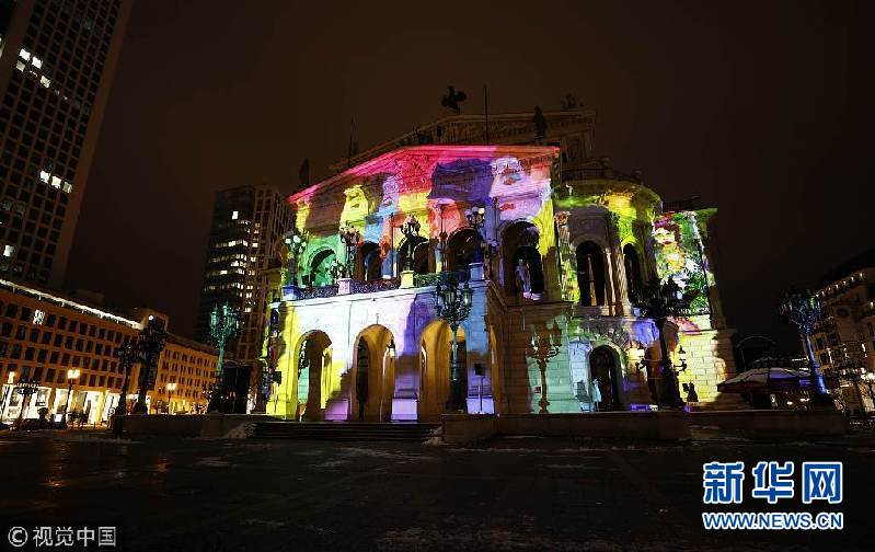 德国法兰克福市政厅上演梦幻灯光秀 吸引民众驻足观看