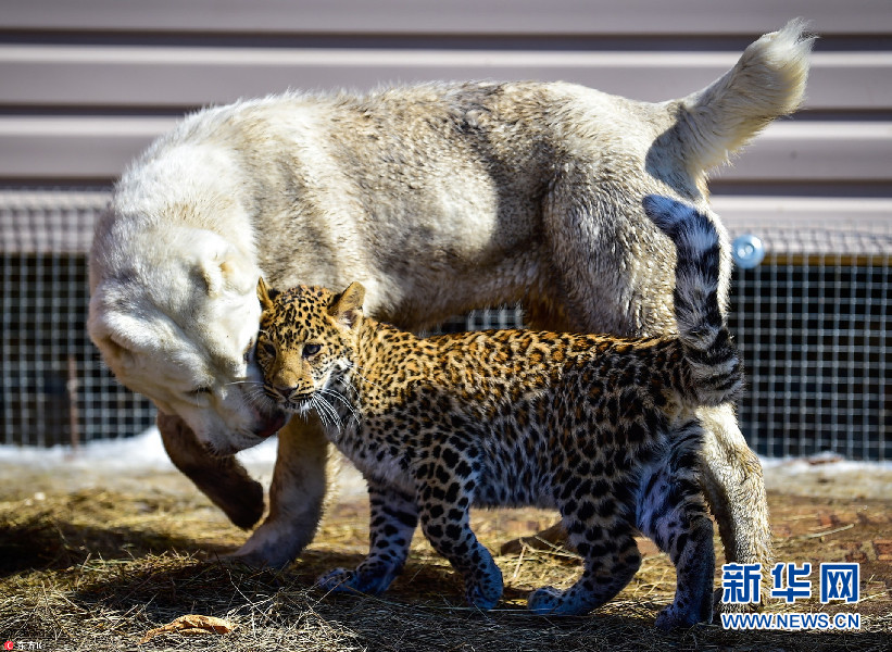 当地时间2018年3月17日,俄罗斯符拉迪沃斯托克,中亚牧羊犬Elza暖心照顾一只非洲豹幼崽Milasha。小Milasha于2017年出生在Sadgorod动物园,并由金毛猎犬Tessi喂养长大。图片来源:东方IC