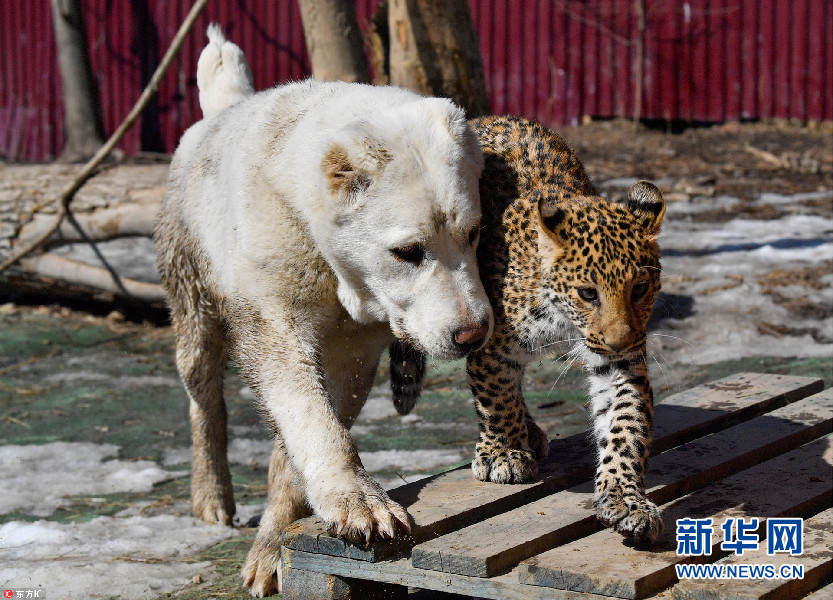 当地时间2018年3月17日,俄罗斯符拉迪沃斯托克,中亚牧羊犬Elza暖心照顾一只非洲豹幼崽Milasha。小Milasha于2017年出生在Sadgorod动物园,并由金毛猎犬Tessi喂养长大。图片来源:东方IC