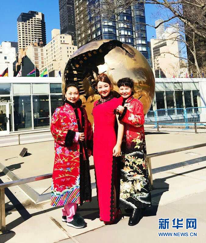 “浙商女杰”理事会主席团主席、赛丽正宏集团总裁夏赛丽(左)与浙商女杰理事会执行会长、金泰国际控股集团董事长张虹(中)和苏州鲁师傅家具董事长胡惠萍在联合国门口合影留念。新华网发
