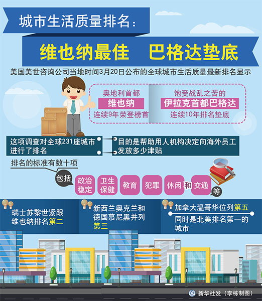 图表:城市生活质量排名:维也纳最佳 巴格达垫底 新华社发 李栋制图