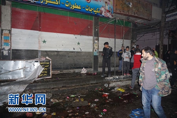 这是3月20日在叙利亚首都大马士革东南杰尔马纳地区拍摄的遭火箭弹袭击的一个市场。新华社发