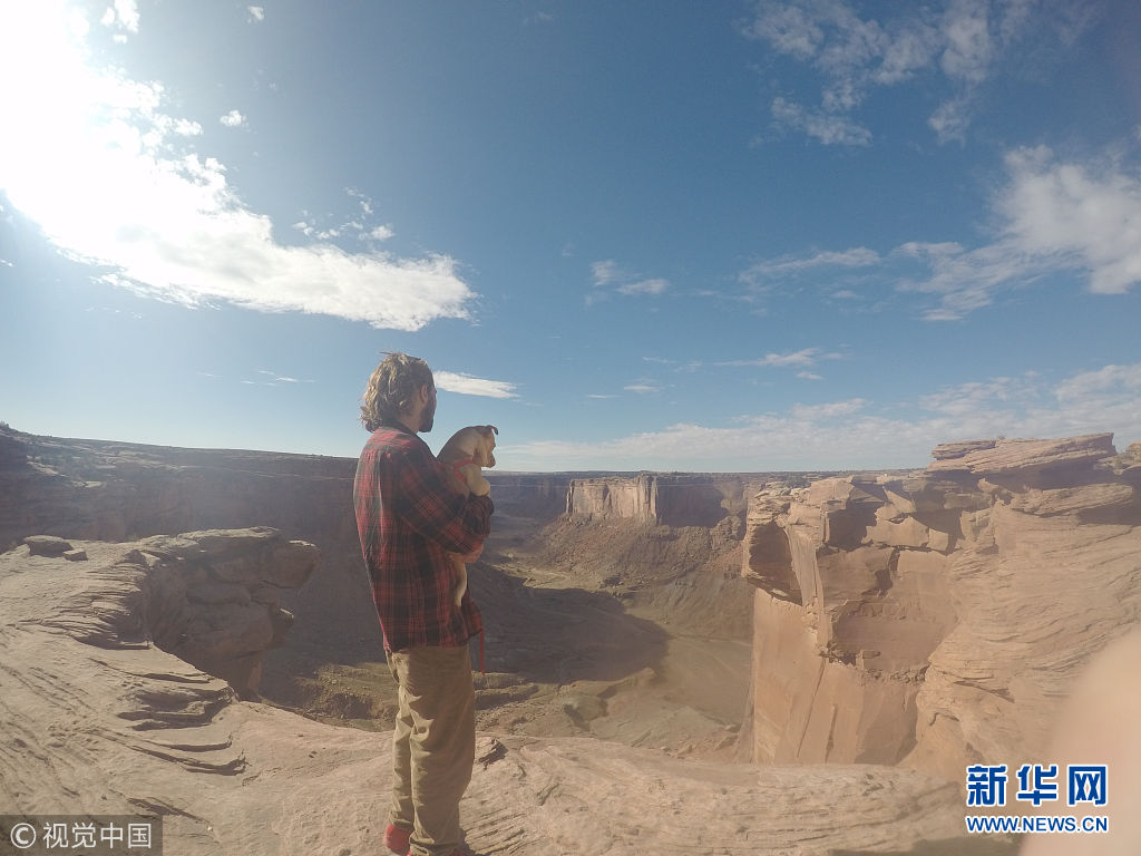 24岁的探险家Chase Reinford与狗狗paco在途中。Chase Reinford一次在美国犹他州荒无人烟的沙漠中开着房车前进,突然一个瘦小的身影冲到车边,原来是一只流浪狗。这只狗一点也不怕生,径直往他怀里钻,于是他收留了它,取名paco。他本以为自己的生活方式会让狗狗感到害怕和不适应,没想到paco天性就“胆大包天”,无论是对摩托快艇、低空跳伞还是探险都丝毫没有感到害怕,紧紧地跟在主人的身边。(图片来源:视觉中国)