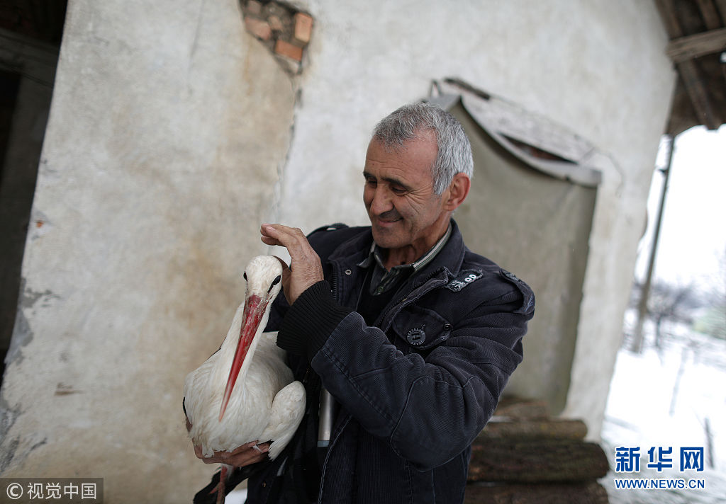 3月21日,保加利亚Zaritsa村,村民将在暴雪中受伤的鹳带回家救助。(图片来源:视觉中国)