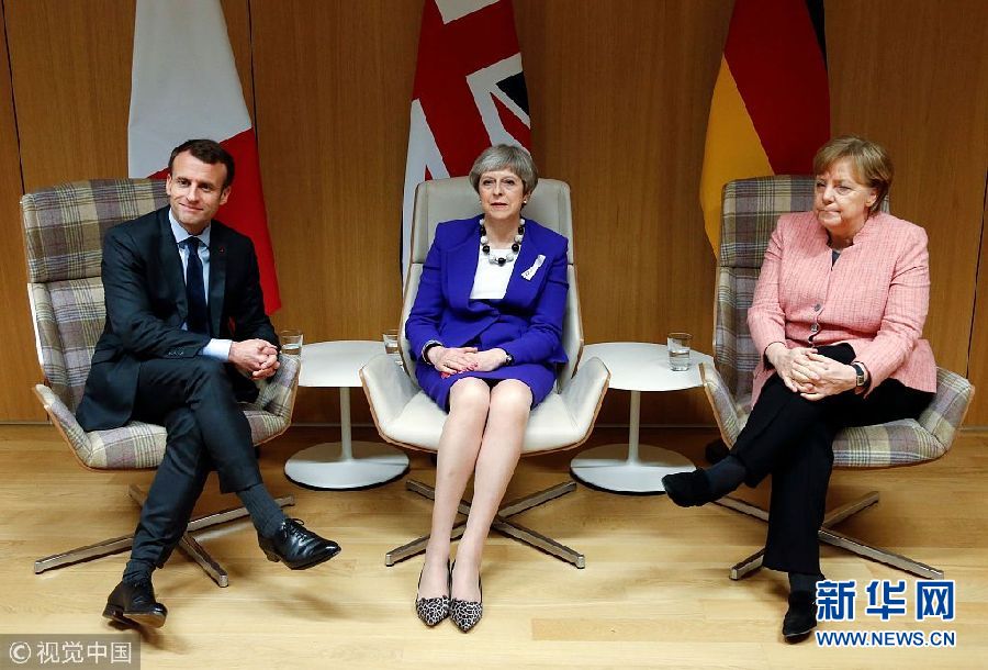 当地时间3月22日,比利时布鲁塞尔,新一轮欧盟峰会举行,法国总统马克龙、英国首相特雷莎·梅、德国总理默克尔举行三边会谈。 (图片来源:视觉中国)