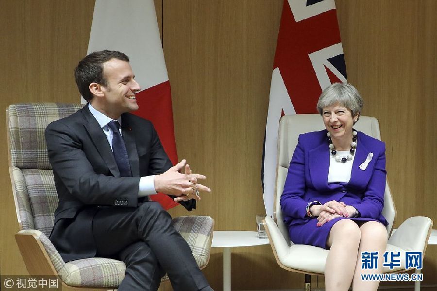 当地时间3月22日,比利时布鲁塞尔,新一轮欧盟峰会举行,法国总统马克龙、英国首相特雷莎·梅、德国总理默克尔举行三边会谈。 图为法国总统马克龙和英国首相特雷莎·梅交谈。(图片来源:视觉中国)