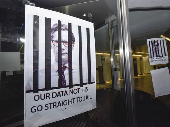 3月20日,一张抗议标语张贴在剑桥分析公司办公室玻璃上,标语上写着:“我们的数据不是他的,直接关入大牢。”(新华社发)