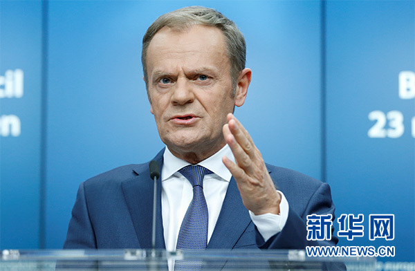 3月23日,在比利时布鲁塞尔欧盟总部,欧洲理事会主席图斯克出席新闻发布会。新华社记者 叶平凡 摄
