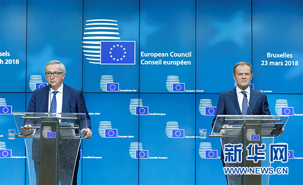 3月23日,在比利时布鲁塞尔欧盟总部,欧盟委员会主席容克(左)和欧洲理事会主席图斯克出席新闻发布会。新华社记者 叶平凡 摄