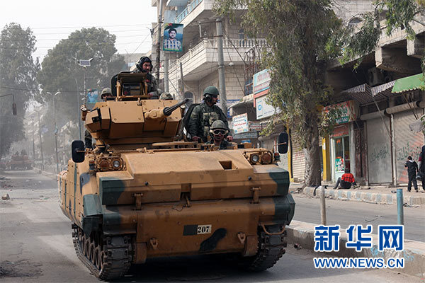 3月24日,在叙利亚阿夫林,一辆土耳其装甲车在城区驶过。新华社发
