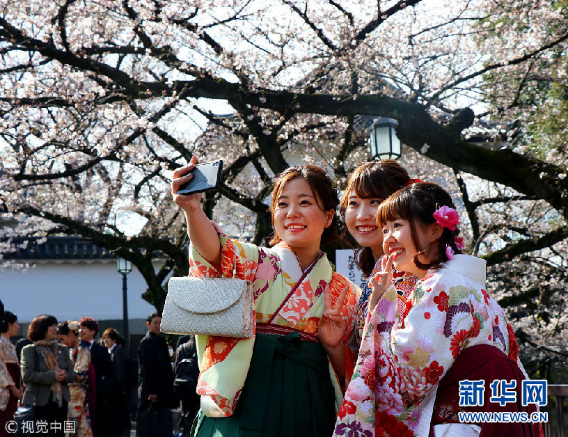 当地时间2018年3月24日,游人在皇居附近的樱花树下合影留念。(图片来源:视觉中国)