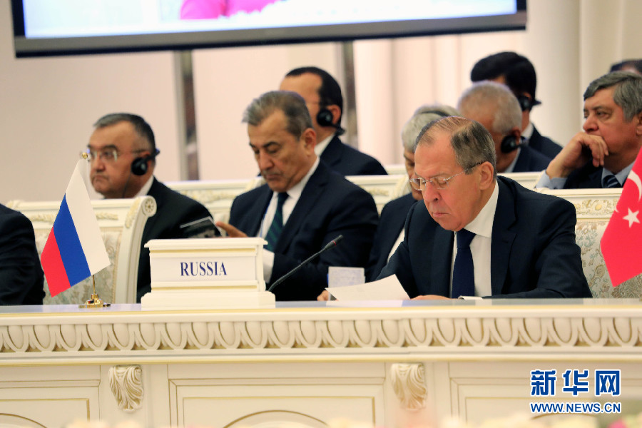 俄罗斯外长拉夫罗夫(前排右一)出席会议。阿富汗问题高级别会议27日在乌兹别克斯坦首都塔什干举行。新华社记者周良摄