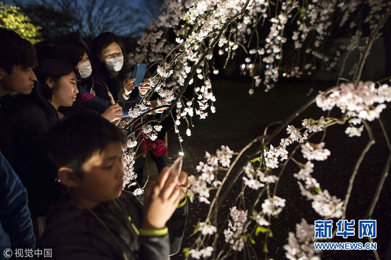 日本樱花季: “夜樱”流光溢彩 游客漫步赏樱