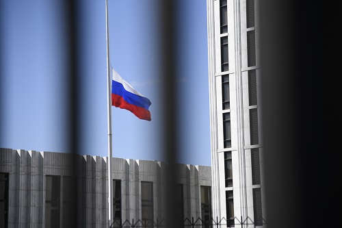 这是3月26日在美国首都华盛顿拍摄的俄罗斯驻美国大使馆内的俄罗斯国旗。新华社记者杨承霖摄