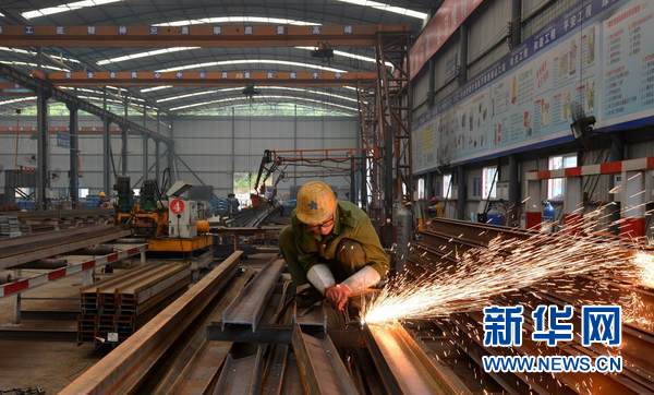 月27日,在老挝南塔省,中铁五局工人在车间内加工铁路施工材料。新华网发 刘艾伦摄