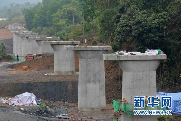 这是3月27日在老挝南塔省航拍的正在施工建设中的桥梁。新华网发 刘艾伦摄