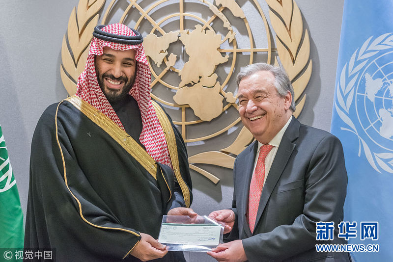 3月27日,美国纽约,沙特王储穆罕默德·本·萨勒曼访问联合国总部,签署向也门人道主义援助计划自愿财政资助备忘录。(图片来源:视觉中国)