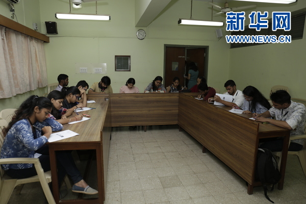 3月25日,在孟买大学孔子学院举行的第十七届“汉语桥”印度孟买赛区预选赛中,选手们在进行笔试答题。新华网发(图片由主办方提供)