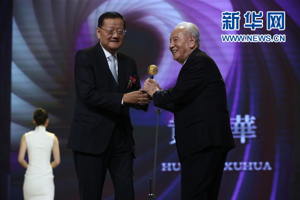 在2018年3月30日晚举行的“世界因你而美丽——2017-2018影响世界华人盛典”上,黄旭华院士(右)荣膺“影响世界华人终身成就奖”。新华网发(凤凰卫视供图)