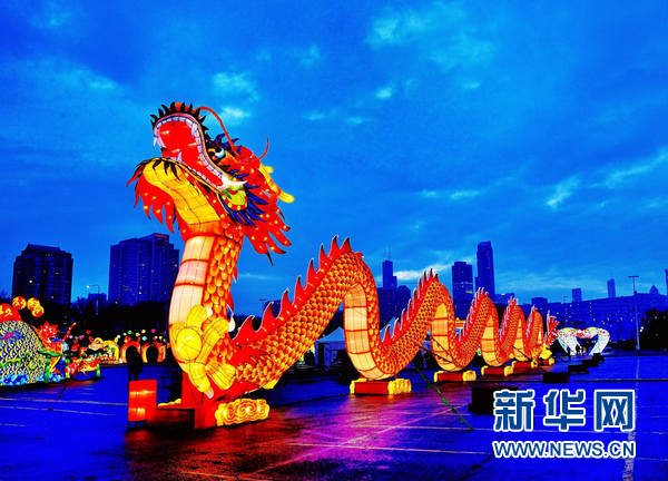 在美国芝加哥,灯展上展出的长达200多英尺、高度近两层楼的彩灯“中国龙”。