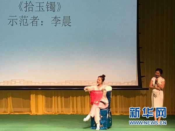 4月1日,袁慧琴京剧艺术讲座,袁慧琴请演员示范表演。新华社记者王丽丽 摄
