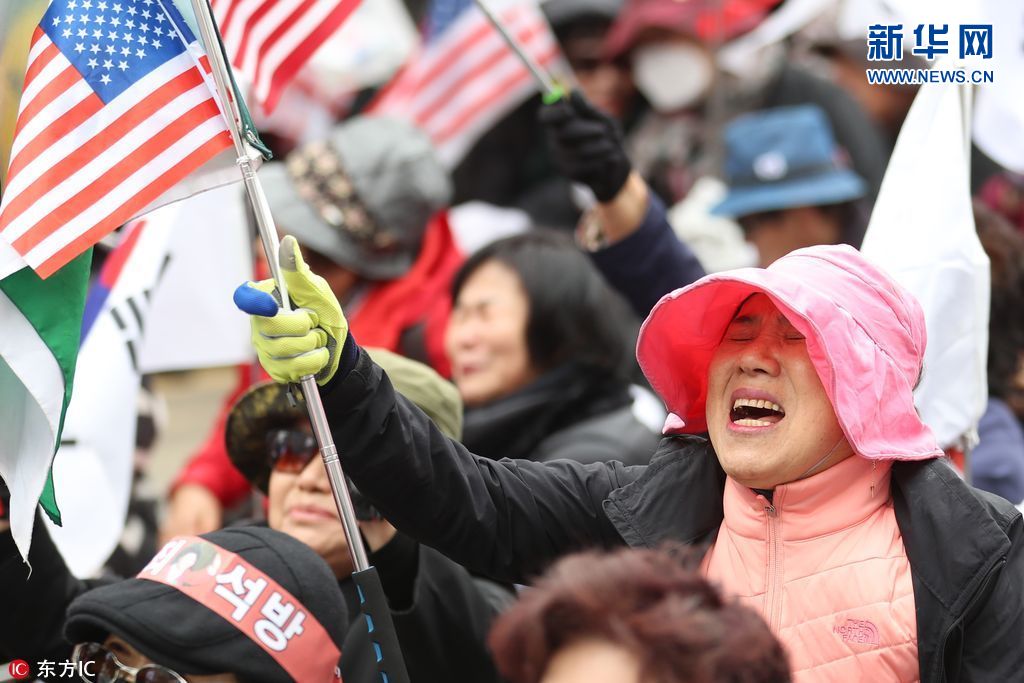 4月6日,韩国首尔,在首尔中央地方法院前,举行集会的韩国前总统朴槿惠的支持者得知朴槿惠一审获刑24年伤心落泪。据报道,首尔中央地方法院对韩国前总统朴槿惠作出一审宣判,判处其有期徒刑24年,罚款180亿韩元(约合人民币1.06亿元)。(图片来源:东方IC)