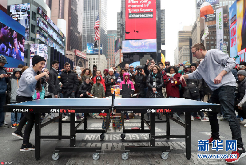 美国纽约时报广场举办颠乒乓球比赛 庆祝世界乒乓球日