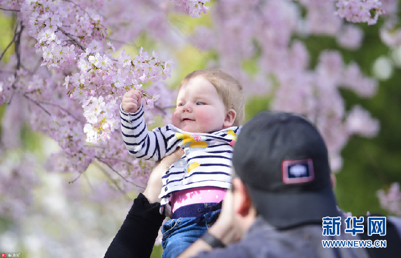美国华盛顿迎来浪漫樱花季 小萌娃赏樱一脸陶醉
