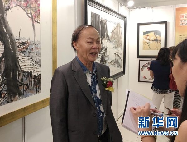 钟正川在画展现场接受媒体访问。新华网发 王大玮摄