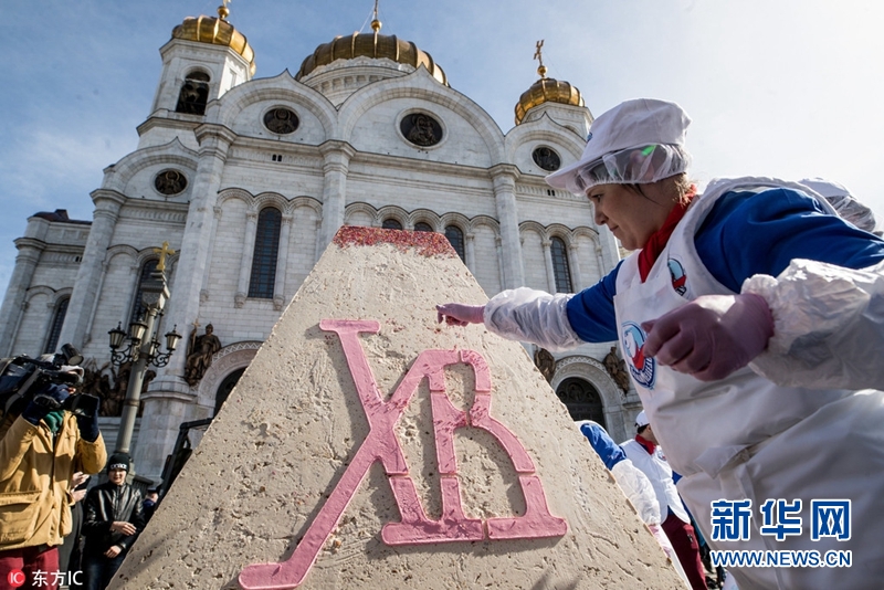 当地时间2018年4月8日,俄罗斯莫斯科,为庆祝东正教复活节,莫斯科救世主大教堂前现一个1141公斤的传统复活节蛋糕,打破吉尼斯世界纪录。(图片来源:东方IC