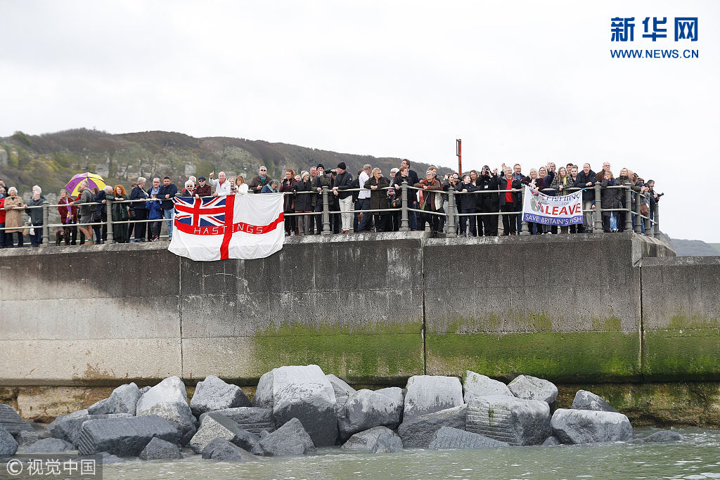 4月8日,英国黑斯廷斯,支持“脱欧”的英国民众驾船抗议脱欧过渡协议。(图片来源:视觉中国)