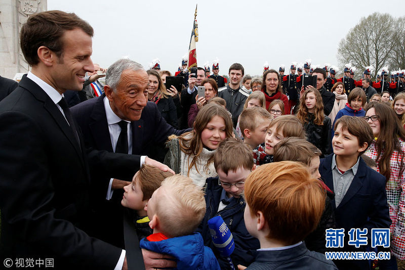 4月9日,法国里什堡,法国总统马克龙和葡萄牙总统马塞洛·雷贝洛·德索萨在一战葡萄牙公墓出席一战纪念仪式,纪念利斯战役百年。(图片来源:视觉中国)